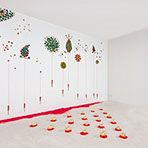 Apple Of Discord Project, 2014, Gilded apples, processed apple slices, knives, red yarn, flocking powder, 250cm x 450cm x 200cm - Detail