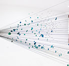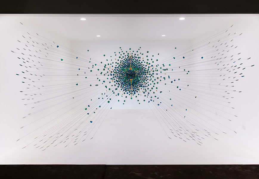 Hundreds of gilded, dried and hand-dyed apple slices are pinned to the wall and threaded onto a taut, cotton string. Surrounded by a mass of stainless steel knife blades, they burst into space forming a large bloom-like shape with black tendrils that pull the audience towards it.