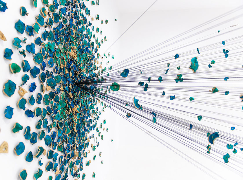 BLUEMING II, 2018, Biennale Of Australian Art. Hand processed apple slices, gold leaf, stainless steel knife blades, cotton string, pins. Dimensions: 5m x 4.5m x 2.5m
