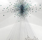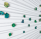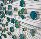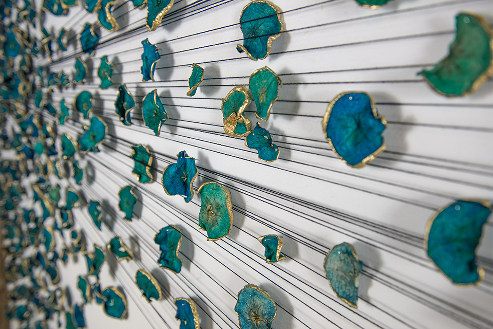 Hundreds of gilded, dried and hand-dyed apple slices are pinned to the wall and threaded onto a taut, cotton string. Surrounded by a mass of stainless steel knife blades, they burst into space forming a large bloom-like shape with black tendrils that pull the audience towards it.