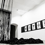 BOUND, 2017 - black fabric, wooden chair, black paint, paper, ink. Gallery dimensions: 16m x 6m x 4m