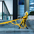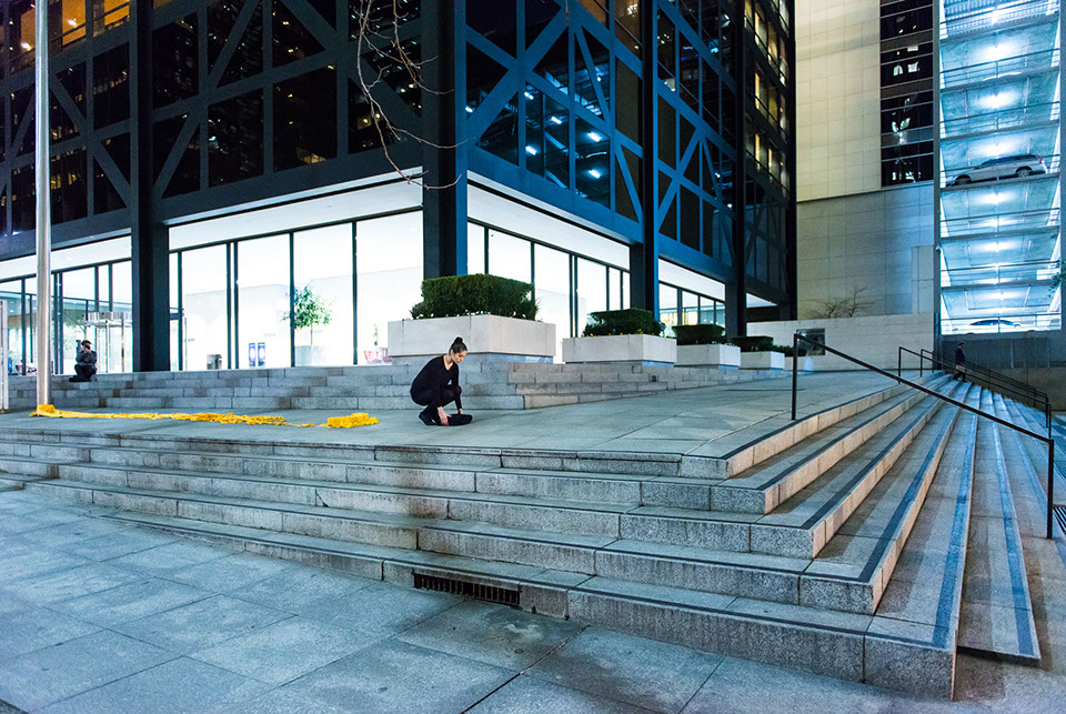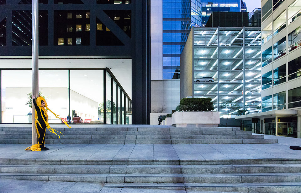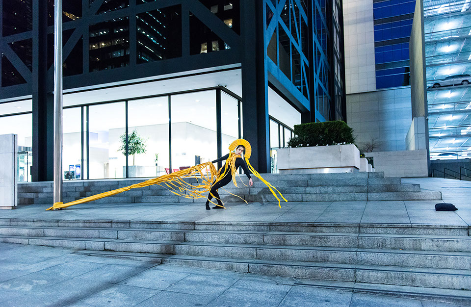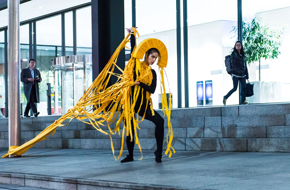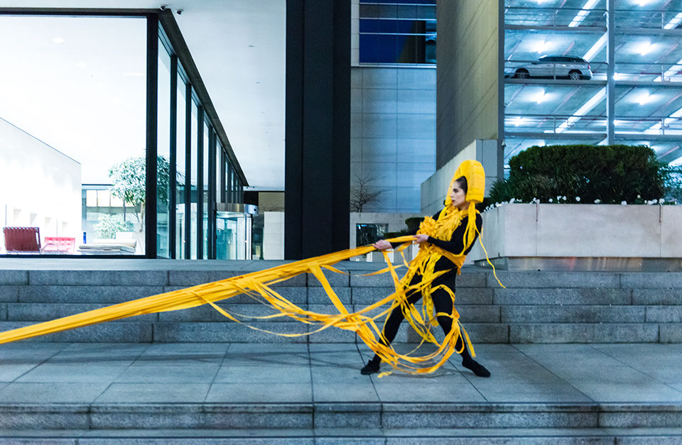 The yellow fabric entangling the performer's body alludes to obstacles and past hindrances that the artist is trying to break away from. The silent, ritualistic action of pulling, de-tangling, taking off the headdress - the past, and putting on the coat - the future, communicates struggle, change and hope. The work questions whether it is necessary to completely sever the links to negative past experiences in order to make space for forward movement and change.