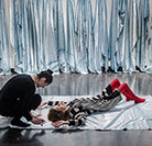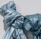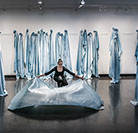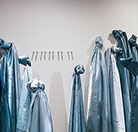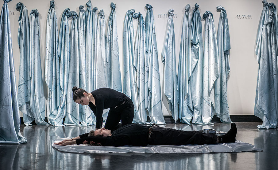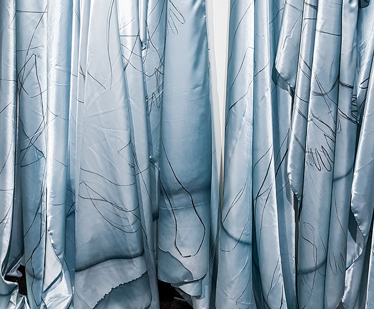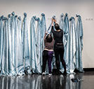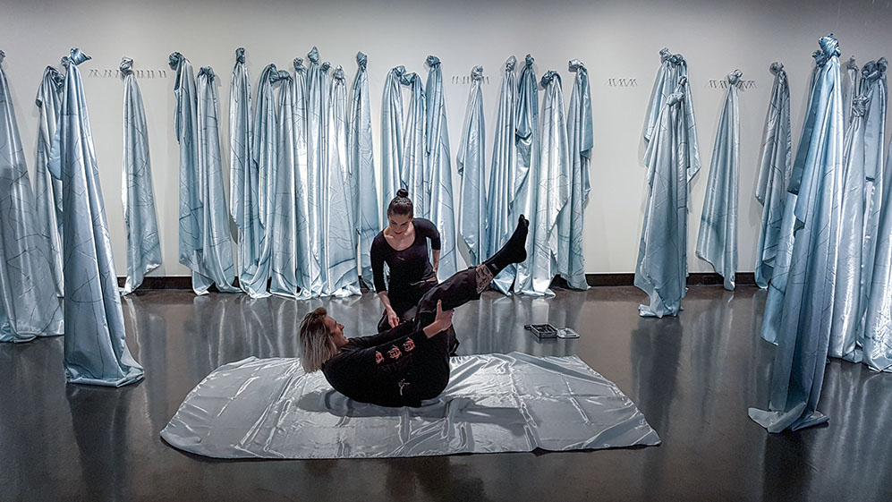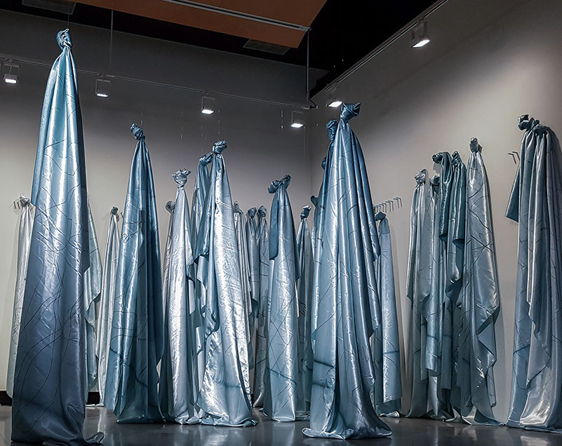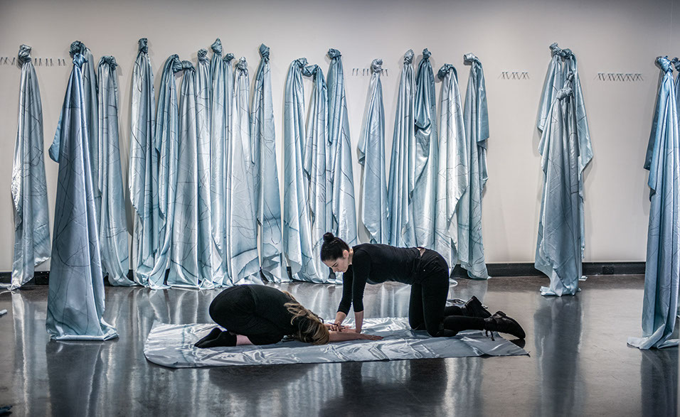 THE GATHERING, 2019, hand dyed satin, charcoal, ink, pins, timber, nylon string. Dimensions variable.