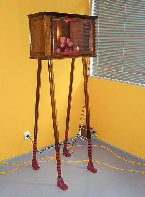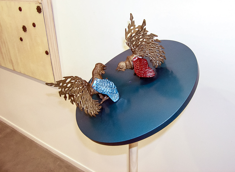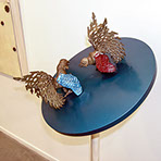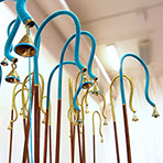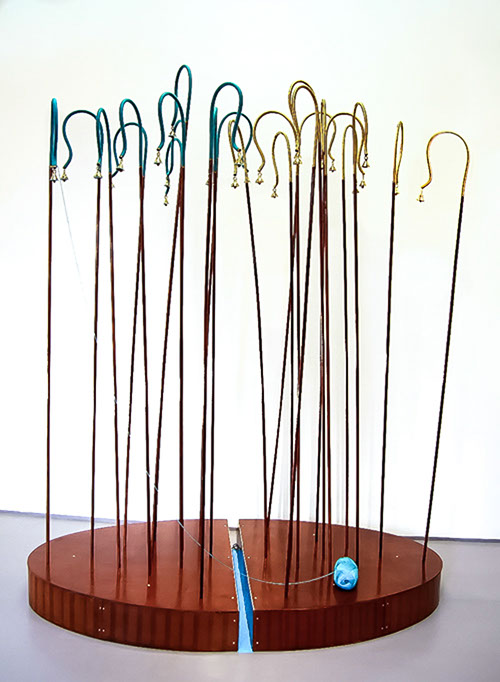 "The element of wit also appears in this show, as when a dribble of white thread complete with drops gives point to Fata’s Milk. All these assemblages are appealing but movement makes Nomadic Wonders outstanding. A group of tall, red shepherds, crooks bound at the top, are adorned with bells. A hidden mechanism shakes them to produce a lilting sound across the meadows of the mind.”