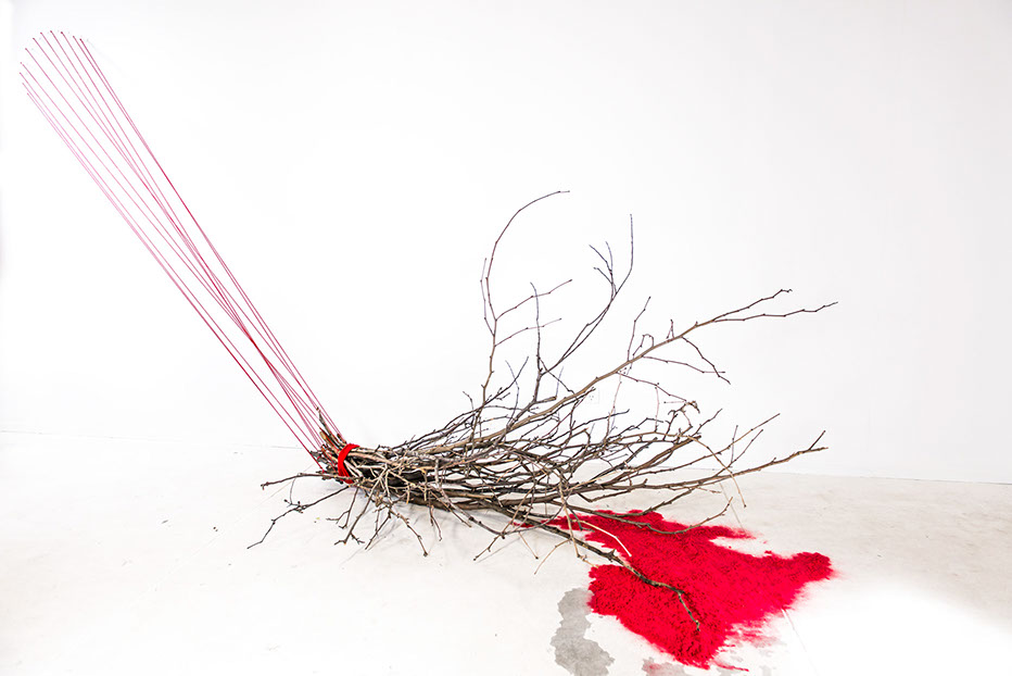 Apple Of Discord Project, 2014, Branches, red yarn, flocking powder, 250cm x 300cm - Detail