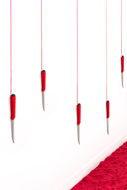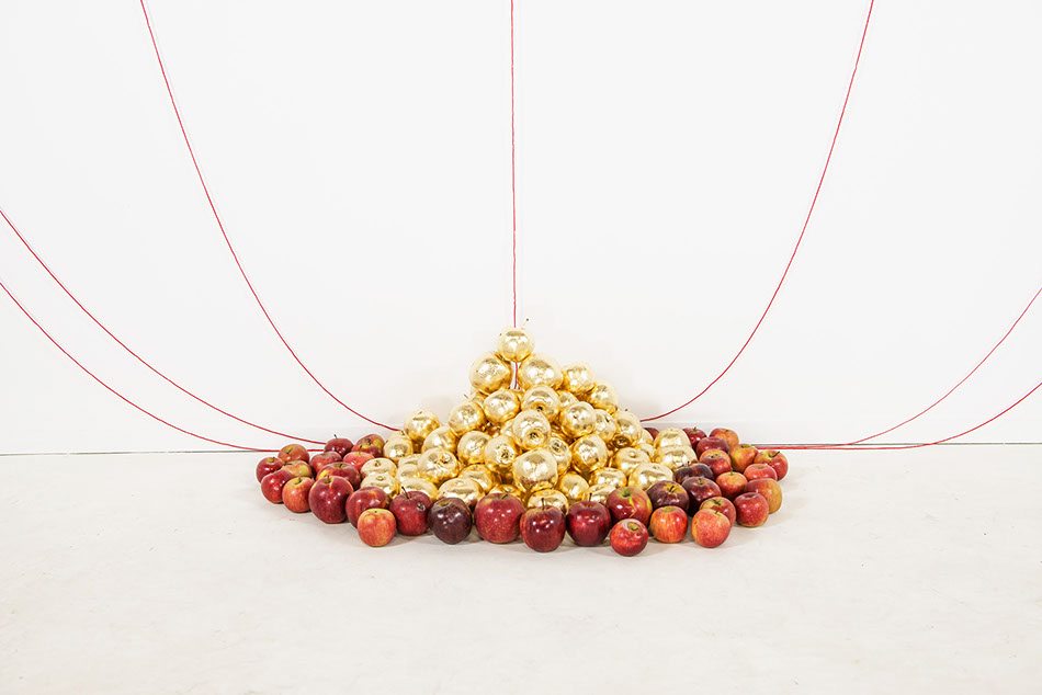 Apple Of Discord Project, 2014, Gilded apples, processed apple slices, knives, red yarn, flocking powder, 250cm x 450cm x 200cm - Detail