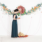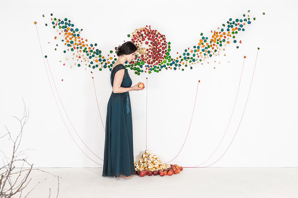 Apple Of Discord Project, 2014, Apples, gold leaf, processed apple slices, pins, red yarn, 250cm x 390cm