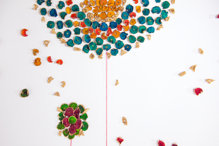 Apple Of Discord Project, 2014, Apples, gold leaf, processed apple slices, pins, red yarn, 250cm x 390cm - Detail