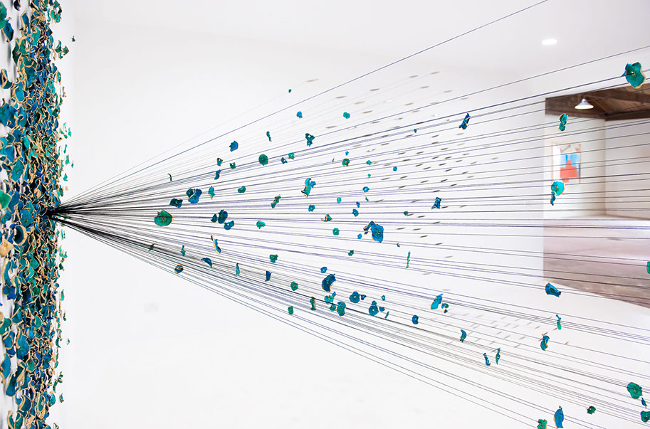 BLUEMING II, 2018, Biennale Of Australian Art. Hand processed apple slices, gold leaf, stainless steel knife blades, cotton string, pins. Dimensions: 5m x 4.5m x 2.5m