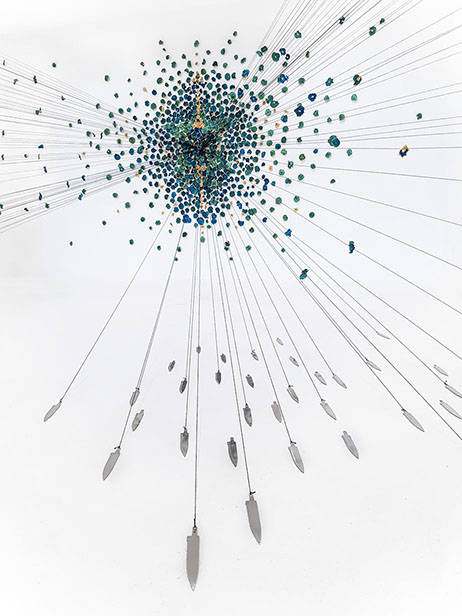 Hundreds of gilded, dried and hand-dyed apple slices are pinned to the wall and threaded onto a taut, cotton string. Surrounded by a mass of stainless steel knife blades, they burst into space forming a large bloom-like shape with black tendrils that pull the audience towards it.