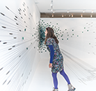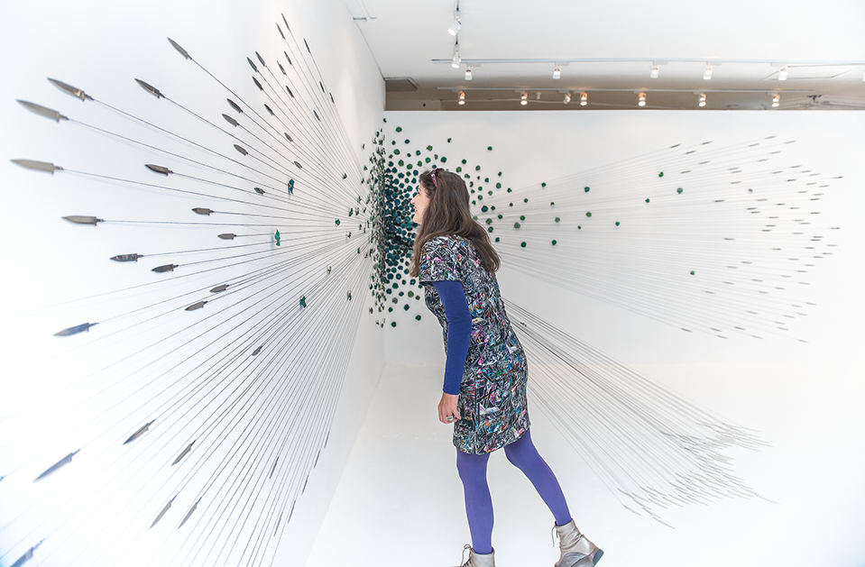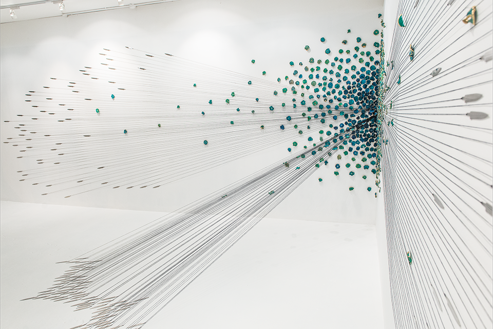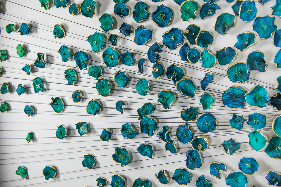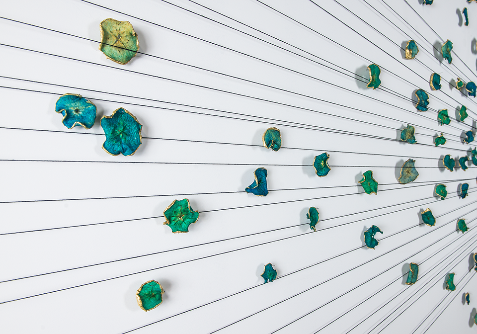 Hundreds of gilded, dried and hand-dyed apple slices are pinned to the wall and threaded onto a taut, cotton string. Surrounded by a mass of stainless steel knife blades, they burst into space forming a large bloom-like shape with black tendrils that pull the audience towards it.