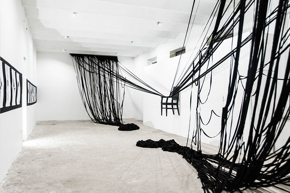 BOUND, 2017 - black fabric, wooden chair, black paint, paper, ink. Gallery dimensions: 16m x 6m x 4m
