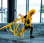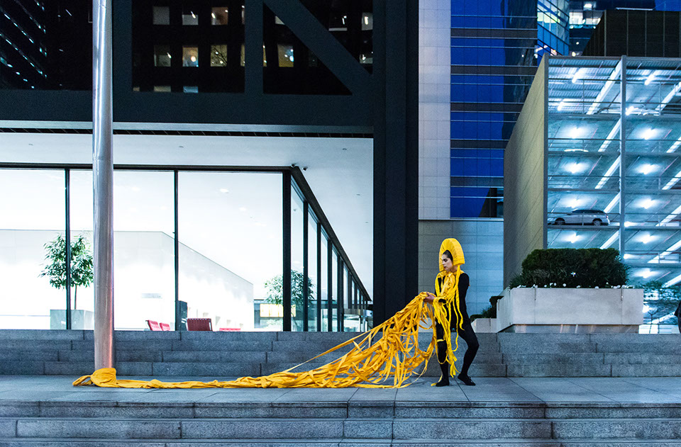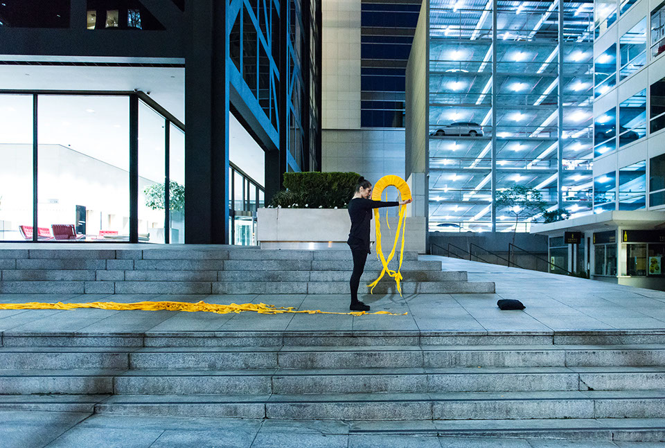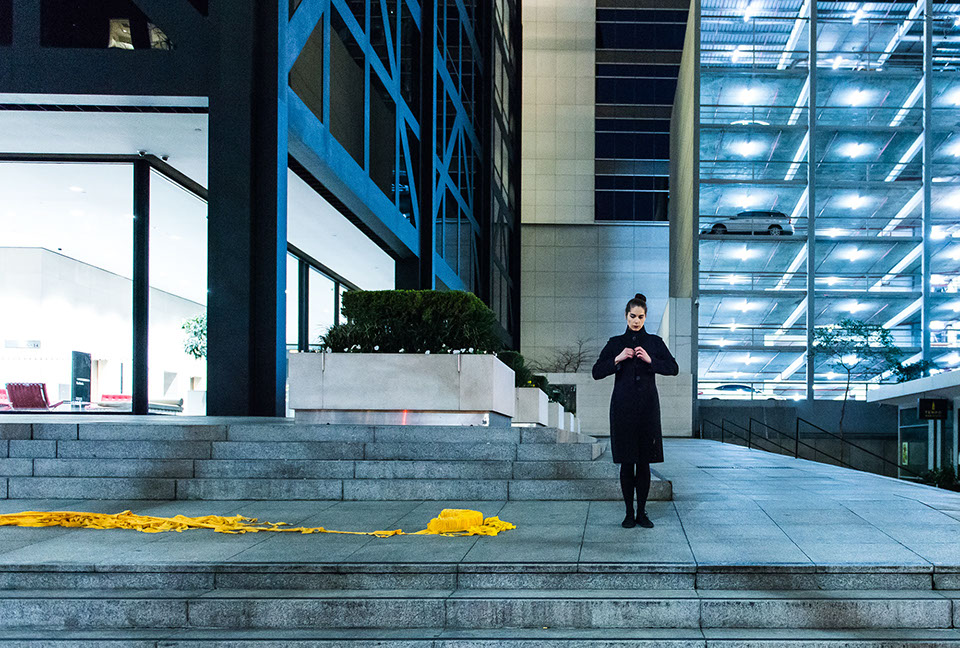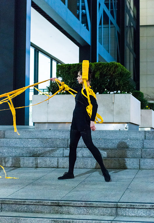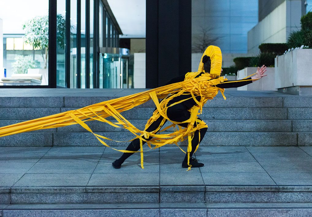 The yellow fabric entangling the performer's body alludes to obstacles and past hindrances that the artist is trying to break away from. The silent, ritualistic action of pulling, de-tangling, taking off the headdress - the past, and putting on the coat - the future, communicates struggle, change and hope. The work questions whether it is necessary to completely sever the links to negative past experiences in order to make space for forward movement and change.