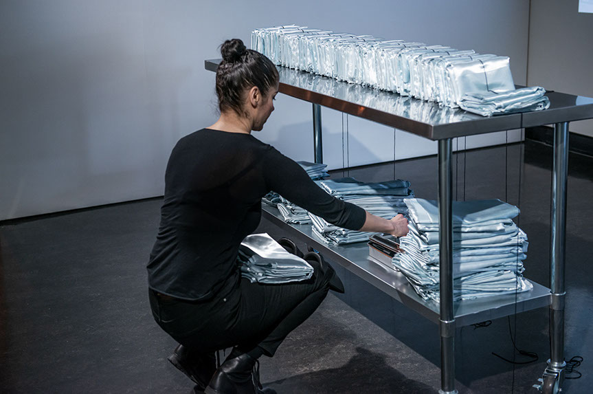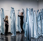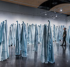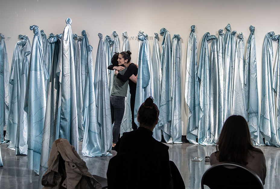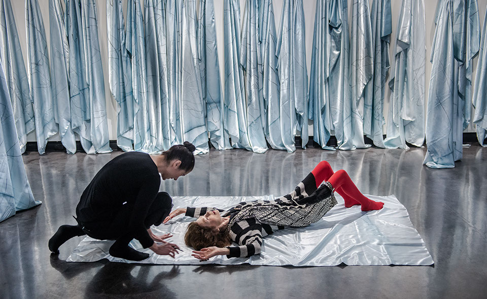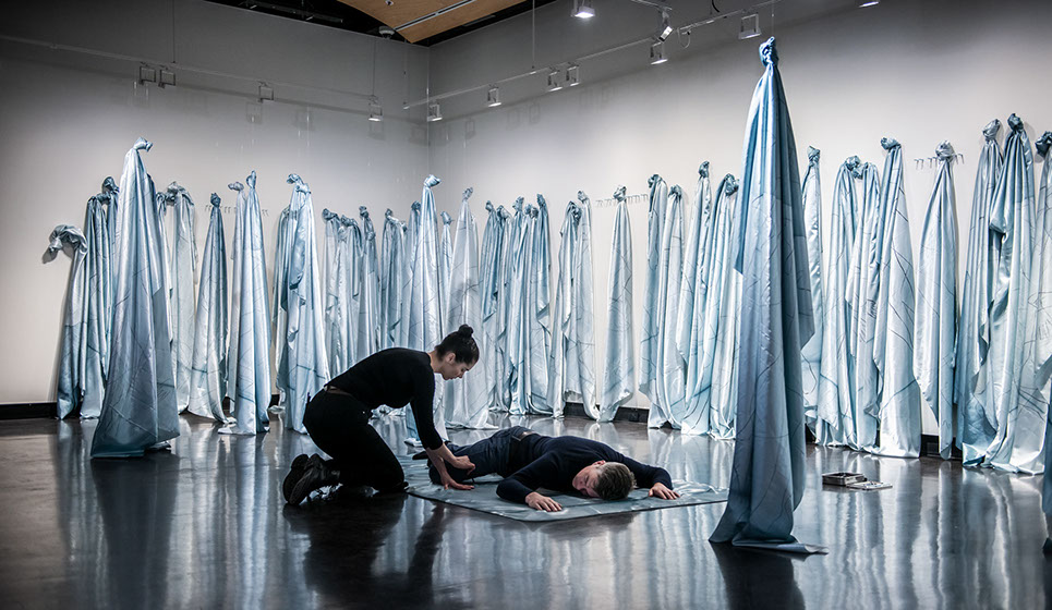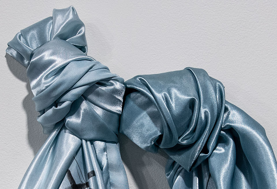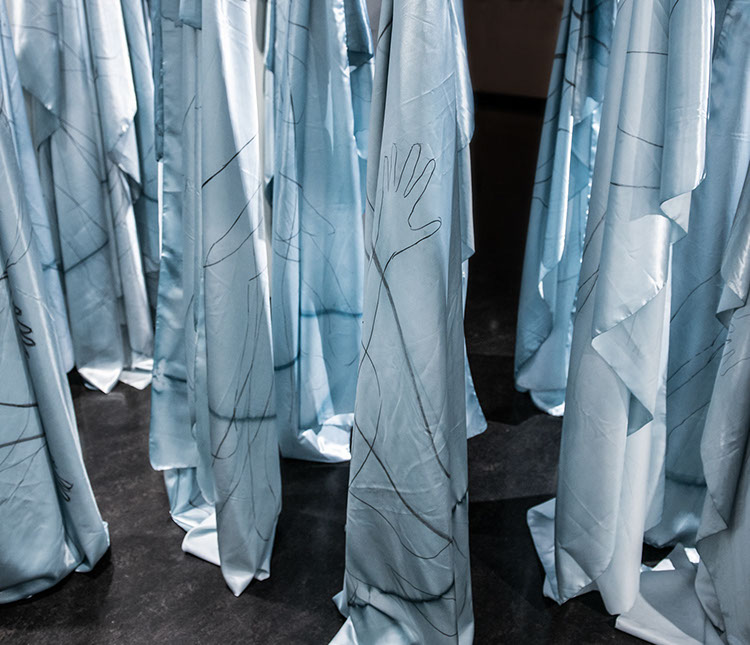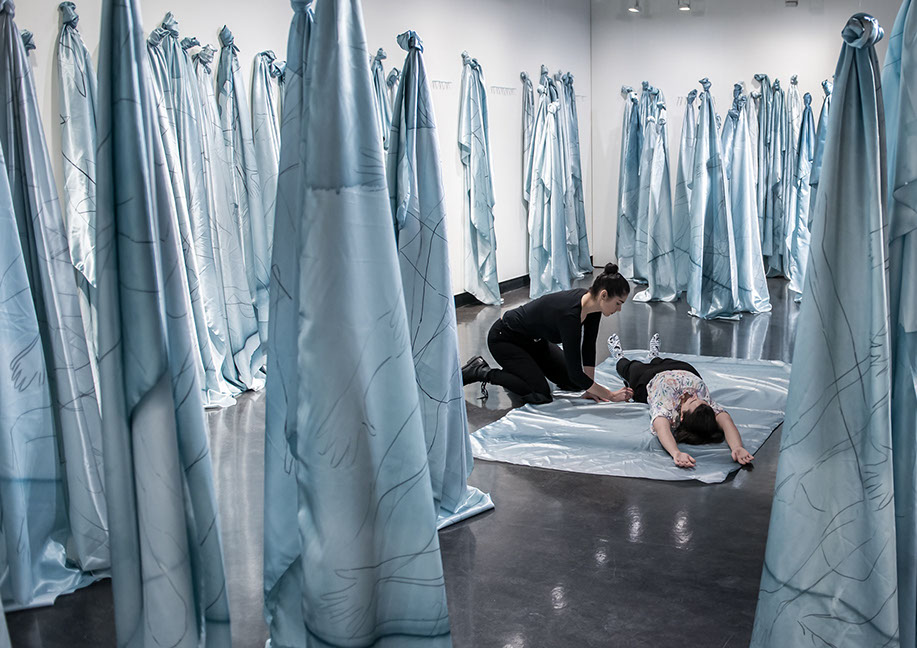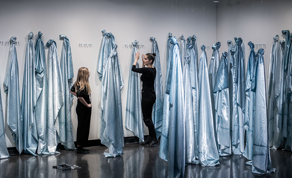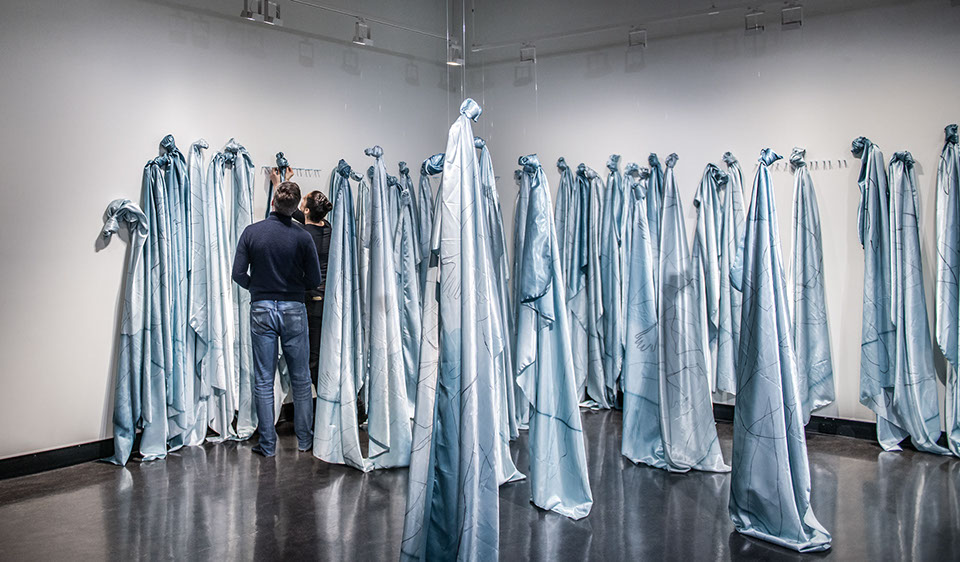 THE GATHERING, 2019, hand dyed satin, charcoal, ink, pins, timber, nylon string. Dimensions variable.