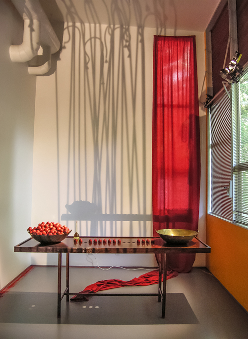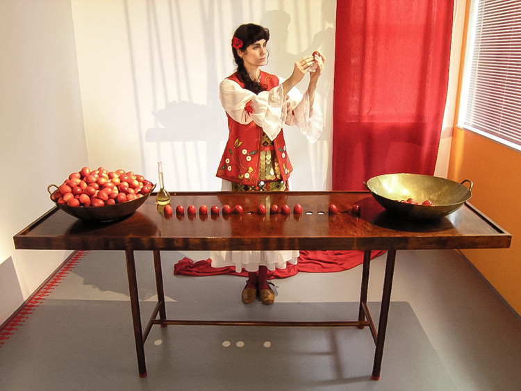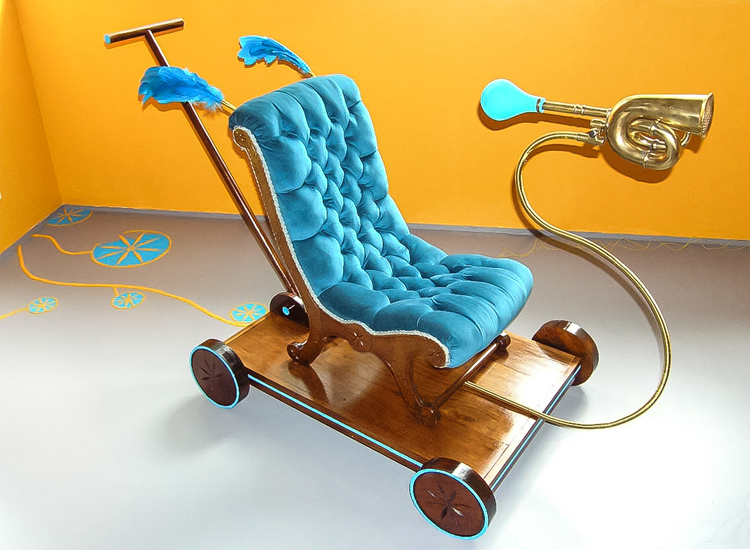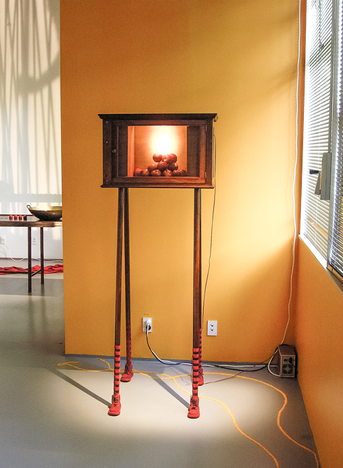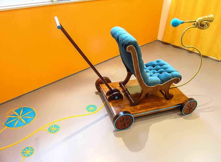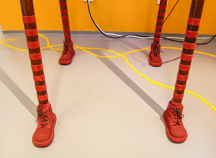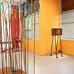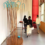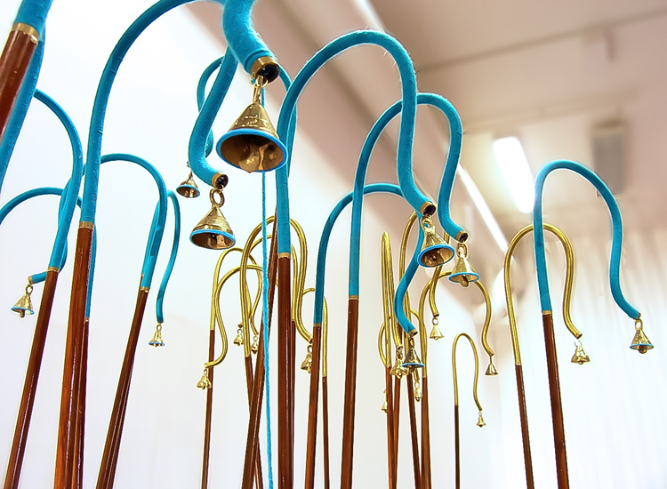 "The element of wit also appears in this show, as when a dribble of white thread complete with drops gives point to Fata’s Milk. All these assemblages are appealing but movement makes Nomadic Wonders outstanding. A group of tall, red shepherds, crooks bound at the top, are adorned with bells. A hidden mechanism shakes them to produce a lilting sound across the meadows of the mind.”